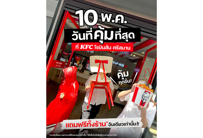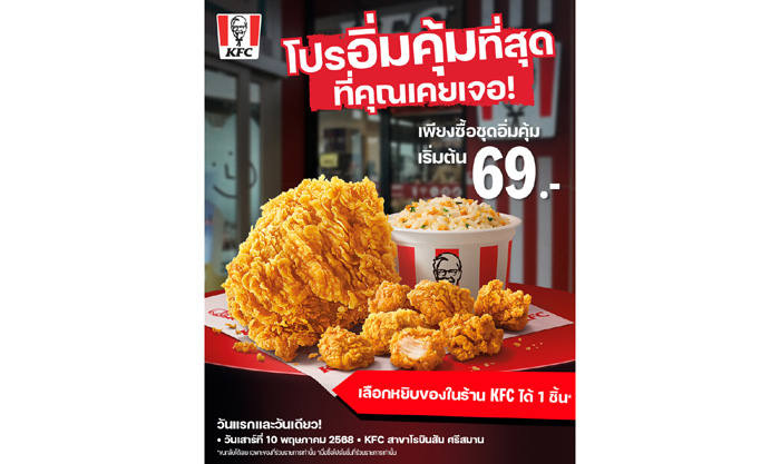หลังจากที่เปิดตัว โปรโมชันชุดอิ่มคุ้ม ในราคาเริ่มต้นเพียง 69 บาท พร้อมหนังโฆษณาสุดจะคุ้ม เคเอฟซีตอกย้ำความคุ้มเกินเรื่องด้วยกิจกรรมสุดปั่น ‘โปรอิ่มคุ้มที่สุดที่คุณเคยเจอ’ ที่รับรองได้ว่ามาเคเอฟซีคุ้มสุดกว่าที่เคยเจออย่างแน่นอน! KFC ประเทศไทย แบรนด์ไก่ทอดอันดับหนึ่ง เขย่าวงการความคุ้มที่ทุกคนเคยเจอมา ครั้งนี้ KFC เสิร์ฟทั้งรสชาติความอิ่มท้องแถมได้เลือกของสมนาคุณเอง ขนกลับบ้านกันแบบไม่มีกั๊ก! กับโปรโมชันอิ่มคุ้มที่สุดที่คุณเคยเจอ อิ่มไก่แถมได้ของกลับ ใครอยากได้อะไร ของชิ้นไหน มาขนกลับบ้านไปได้เลยที่ KFC สาขาโรบินสัน ไลฟ์สไตล์ ศรีสมาน วันเสาร์ที่ 10 พฤษภาคม 2568 วันเดียวเท่านั้น!