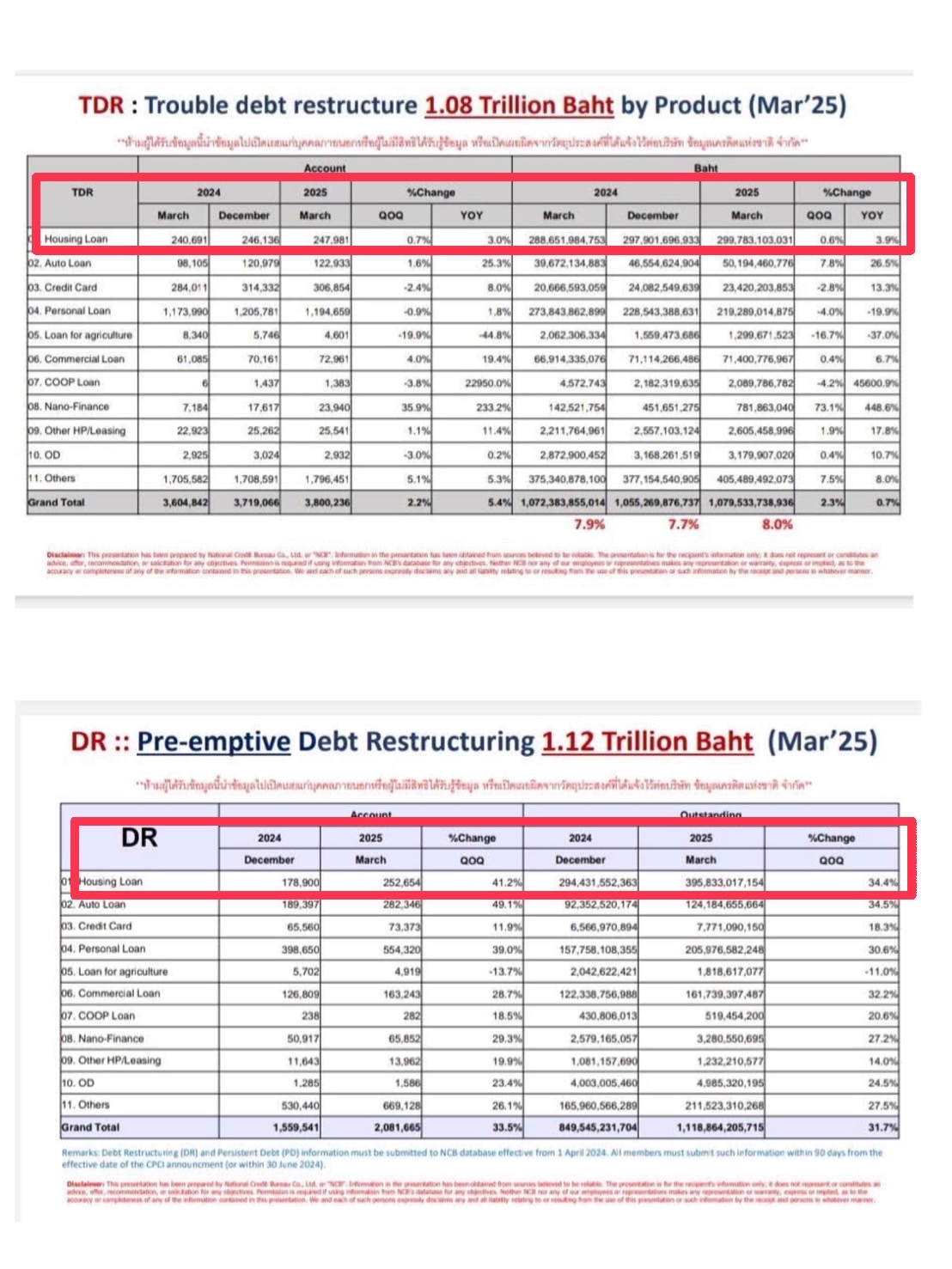 ส่วนการปรับปรุงโครงสร้างหนี้หลังเป็นหนี้เสีย (TDR) ในกลุ่มบ้าน สะสมอยู่ที่ 299,783 ล้านบาท เพิ่มขึ้นเล็กน้อย 3.9% จากช่วงเดียวกันปีก่อนอยู่ที่ 288,651 ล้านบาท