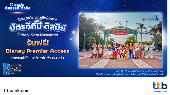 เพื่อชีวิตทุกวันอัศจรรย์ได้จริง ทีเอ็มบีธนชาต หรือ ทีทีบี เดินหน้ามอบสิทธิประโยชน์ที่เหนือกว่ากับประสบการณ์ สุดพิเศษให้กับลูกค้าบัตรเดบิต ทีทีบี ออลล์ฟรี ดิสนีย์ และบัตรเครดิต ทีทีบี ดิสนีย์ รับฟรี บัตร Disney Premier Access – สำหรับสิทธิ์เข้าใช้เครื่องเล่นยอดฮิต 3 เครื่องเล่น จำนวน 2 ใบ เมื่อซื้อแพ็กเกจ “Stay and Play for Two with Early Park Entry” ที่รวมความสนุกและห้องพักโรงแรมในเครือฮ่องกงดิสนีย์แลนด์รีสอร์ทผ่านทางเว็บไซต์ทางการของฮ่องกงดิสนีย์แลนด์และชำระผ่านบัตรเดบิต ทีทีบี ออลล์ฟรี ดิสนีย์ หรือบัตรเครดิต ทีทีบี ดิสนีย์ ระหว่างวันที่ 1 พฤษภาคม 2568 – 15 กรกฎาคม 2568