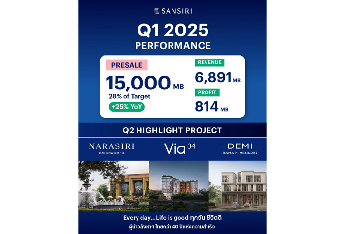 นายวิชาญ วิริยะภูษิต ประธานผู้บริหารสายงานการเงิน บริษัท แสนสิริ จำกัด (มหาชน) หรือ SIRI บริษัทอสังหาริมทรัพย์ชั้นนำของไทย เปิดเผยว่า “ผลประกอบการไตรมาส 1/2568 ของแสนสิริ สะท้อนสภาวะตลาดในช่วงเปลี่ยนผ่าน โดยมียอดขายอยู่ที่ 15,000 ล้านบาท (+25% YoY) เติบโตสูงสุดเมื่อเทียบกับช่วงเดียวกันของปี 2566 และ 2567 ด้านรายได้รวมอยู่ที่ 6,891 ล้านบาท และกำไรสุทธิอยู่ที่ 814 ล้านบาท บริษัทยังคงรักษาฐานะการเงินที่มั่นคงและมีเสถียรภาพพร้อมรับมือกับความผันผวนของตลาดได้ดี สะท้อนจากความเชื่อมั่นของนักลงทุนต่อการเสนอขายหุ้นกู้ด้อยสิทธิที่มีลักษณะคล้ายทุนฯ หรือ Perpetual Bond ที่ได้รับการตอบรับที่ดี นักลงทุนให้ความสนใจสอบถามเข้ามาเป็นจำนวนมาก และคาดว่าจะเปิดให้จองซื้อในช่วงสัปดาห์สุดท้ายของเดือนมิถุนายนนี้”