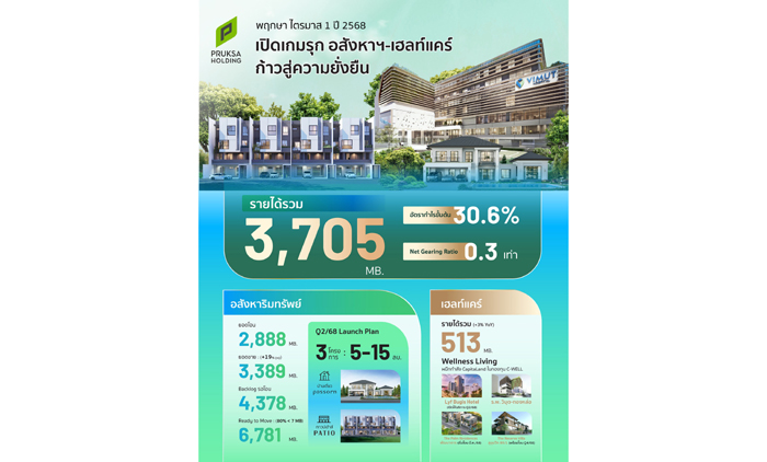 “พฤกษา โฮลดิ้ง” เผยผลการดำเนินงานไตรมาส 1 ปี 2568 รายได้รวม 3,705 ล้าน จากการเปิดเกมรุกอสังหาฯ ครบเซ็กเมนต์ ผนึกกำลังด้านธุรกิจเฮลท์แคร์เดินหน้าสู่ผู้นำด้านเวลเนส เรสซิเดนซ์ การอยู่อาศัยที่ผสานความเป็นอยู่ที่ดีควบคู่การบริการด้านสุขภาพแบบยั่งยืน ยกระดับการอยู่อาศัยที่ “อยู่ดี มีสุข” พร้อมเดินเกมรุกขานรับมาตรการรัฐในไตรมาส 2 ด้วยการจัดแคมเปญ “บิงโกล์ด” ลุ้นบิง ชิงทอง ให้ลูกค้าได้รับสิทธิประโยชน์ครบทุกช่องทาง ทั้งได้ลุ้นรางวัล ได้ฟรีค่าใช้จ่ายในวันโอน และได้ส่วนลดเพิ่มเติม เปิดโอกาสให้เป็นเจ้าของบ้านและคอนโดได้ง่ายขึ้น