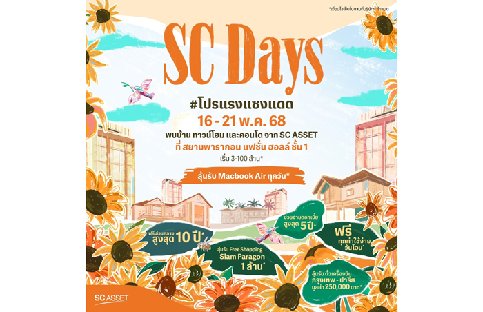 แคมเปญใหญ่ “SC DAYs #โปรแรงแซงแดด” นำโครงการกว่า 81 โครงการ โครงการบ้าน ทาวน์โฮม และคอนโด รวมถึง 6 โครงการใหม่ มาให้ลูกค้าได้เลือกครบจบในที่เดียว พร้อมโปรโมชั่นสุดพิเศษ ช่วยจ่ายดอกเบี้ยสูงสุด 5 ปี*, ฟรี ทุกค่าใช้จ่ายวันโอน, ฟรี ค่าส่วนกลางสูงสุด 10 ปี* พร้อมลุ้นของรางวัลเฉพาะในงานแบบจัดเต็ม อาทิ ลุ้นรับ Macbook Air ทุกวัน* หรือรางวัลใหญ่ตั๋วเครื่องบินไป-กลับ BKK-PARIS จำนวน 2 ที่นั่ง ในระหว่างวันที่ 16-21 พฤษภาคม 68 นี้ ณ ศูนย์การค้าสยามพารากอน* และรางวัลใหญ่สำหรับผู้ที่ซื้อตลอดเดือนพฤษภาคมได้ลุ้น Siam Gift Card มูลค่า 1,000,000 บาท*