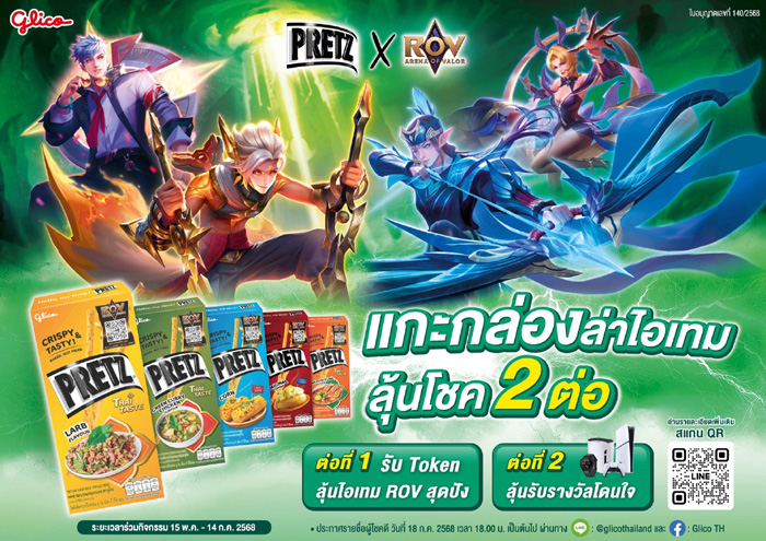 สำหรับแคมเปญ Pretz x ROV ในครั้งนี้ ประกอบด้วยกิจกรรมให้ผู้บริโภคได้ลุ้นรางวัล 2 ต่อ ได้แก่ ต่อที่ 1 การแจกโค้ดไอเท็มในเกมสุดพิเศษกว่า 500,000 ชิ้น และ ต่อที่ 2 การชิงโชคลุ้นรางวัลใหญ่ PlayStation 5 Slim Digital Edition เพียงซื้อผลิตภัณฑ์เพรทซ์ 5 รสชาติยอดนิยม ได้แก่ รสดั้งเดิม, รสข้าวโพด, รสลาบ, รสต้มยำกุ้ง และรสแกงเขียวหวานไก่ (เฉพาะที่มีสัญลักษณ์แคมเปญ Pretz x ROV) และใช้โค้ด 13 หลักจากในกล่อง เพื่อนำไปแลกรับไอเท็มที่หน้ากิจกรรมภายในเกม และลงทะเบียนชิงโชคด้วยโค้ดเดียวกัน ผ่านช่องทาง LINE Official @glicothailand ตั้งแต่วันที่ 15 พ.ค.-14 ก.ค.68 ดูรายละเอียดเพิ่มเติมได้ด้วยการสแกน QR Code หน้ากล่องผลิตภัณฑ์ที่ร่วมรายการ หรือช่องทาง LINE Official @glicothailand