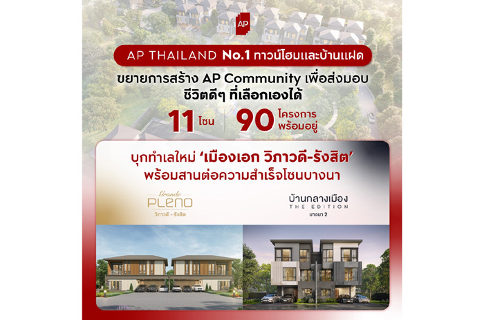 ปัจจุบันกลุ่มธุรกิจทาวน์โฮมและบ้านแฝด สร้าง AP Community ครอบคลุมพื้นที่มากถึง 11 โซน กับจำนวนโครงการพร้อมอยู่มากที่สุดกว่า 90 โครงการและในปีนี้พร้อมขยายความสำเร็จไปยังโซนใหม่อย่าง ‘เมืองเอก วิภาวดี-รังสิต’ บนที่ดินผืนใหญ่กว่า 137 ไร่ ซึ่งมั่นใจด้วยศักยภาพของทำเลจะได้รับการตอบรับไม่ต่างจากโซนอื่นๆ ที่กลุ่มธุรกิจแนวราบร่วมกันพัฒนาไปแล้วกว่า 1,000 ไร่ ซึ่งปัจจุบันเกิดเป็นคอมมิวนิตีที่ดีมีศักยภาพ ทั้งยังสร้างมูลค่าเพิ่ม ที่มากขึ้นให้กับที่ดินในโซนนั้นอย่างที่เราเห็นกันในวันนี้ ไม่ว่าจะเป็นโซน บางนา – รังสิต คลอง 1- ประชาอุทิศ – รามอินทรา บางชัน – บางใหญ่ เป็นต้น
