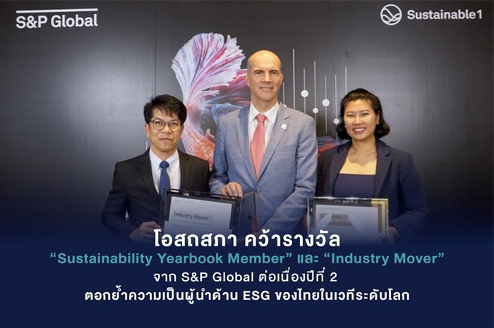 เมื่อวันที่ 20 พฤษภาคม 2568 คุณสาโรจน์ อินทพันธุ์ Head of External Affairs and Sustainability บริษัท โอสถสภา จำกัด (มหาชน) เป็นผู้แทนองค์กรเข้ารับ 2 รางวัลด้านความยั่งยืนจาก S&P Global ได้แก่ S&P Global Sustainability Yearbook 2025 และ รางวัล Industry Mover ติดต่อกันเป็นปีที่ 2 ในงาน S&P Global Sustainability Yearbook 2025 Distinction Ceremony ณ โรงแรมแบงค็อก แมริออท มาร์คีส์ ควีนส์ปาร์ค โดยมีนายโรเบิร์ต ดอร์เนา (Robert Dornau), Head of CSA Corporate Engagement, S&P Global เป็นผู้มอบรางวัล
