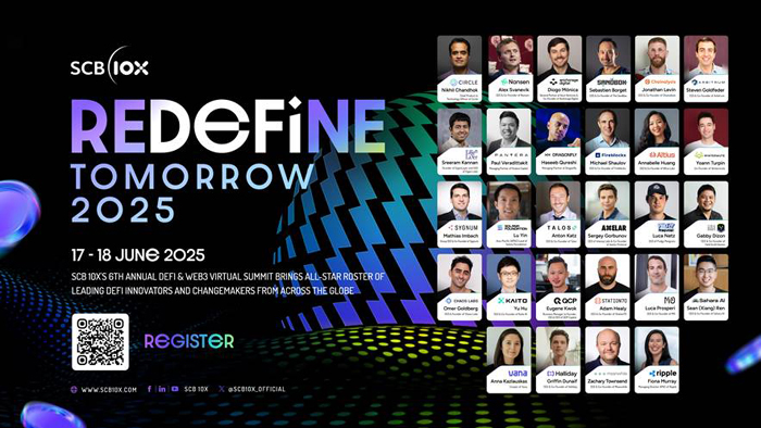 เอสซีบี เท็นเอกซ์ (SCB 10X) บริษัทด้านการลงทุนในเทคโนโลยีเปลี่ยนโลก (Disruptive Technology) ในกลุ่มเอสซีบี เอกซ์ (SCBX Group) ประกาศจัดงานสัมมนาออนไลน์ประจำปีระดับโลก “REDeFiNE TOMORROW 2025: DeFi & Web3 Virtual Summit” ครั้งที่ 6 ซึ่งจะจัดขึ้นระหว่างวันที่ 17–18 มิถุนายน 2568 ตั้งแต่เวลา 08.00–18.00 น. โดยผู้สนใจทั้งในประเทศไทยและทั่วโลกสามารถเข้าร่วมรับชมได้ฟรี