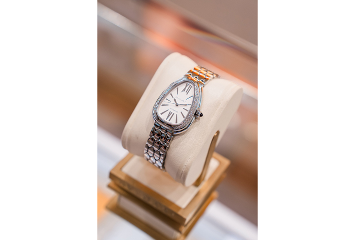 จากนั้นที่บูติก CORTINA WATCH ชั้น G พบกับเรือนเวลาสำหรับสุภาพสตรี Franck Muller Vanguard Lady ที่นำเสนอความสง่างามอันเป็นเอกลักษณ์จากคอลเลกชัน Vanguard Lady ที่โดดเด่นด้วยตัวเลขบอกชั่วโมงสีสันสดใส หน้าปัดลาย Sun-stamped และตัวเรือนทรงสปอร์ตดีไซน์กล้าหาญต่อเนื่องด้วยความเย้ายวนและหรูหราอย่างร่วมสมัยจาก BVLGARI กับคอลเลกชัน Serpenti Seduttori Automatic เปล่งประกายด้วย