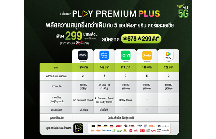 AIS PLAY ตอกย้ำการเป็น The Largest ENTERTAINMENT HUB ที่รวบรวมสุดยอดคอนเทนต์ชั้นนำมากที่สุดอันดับหนึ่ง เดินหน้าสร้างปรากฎการณ์ใหม่ ดึง Prime Video ในฐานะ Exclusive Partner เสริมทัพความบันเทิงระดับโลก ในแพ็กเกจ PLAY PREMIUM PLUS ทำให้แพ็ก PLAY PREMIUM PLUS ยืนหนึ่งแพ็กเกจที่ คุ้มที่สุดในท้องตลาดที่มัดรวม 5 แอปดังยอดนิยมในใจคนไทย ทั้ง Prime Video, Max, iQIYI, VIU และ WeTV พร้อมช่องพรีเมียมจาก Warner Bros. Discovery อีกมากมาย อาทิ HBO, Cartoon Network, CNN และ Discovery Channel สามารถดูพร้อมกันสูงสุด 4 อุปกรณ์ ในราคาสุดคุ้มเพียง 299 บาท/ เดือน (จากราคาปกติ 864 บาท) กด *678*299# โทรออก หรือ https://m.ais.co.th/PPP_NLM
