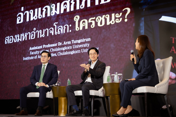 นอกจากนี้ภายในงานยังได้ฟังข้อมูลวิเคราะห์เจาะลึกในหัวข้อ “Global and Thai Economic Turbulence” โดยมีนายบุรินทร์ อดุลวัฒนะ กรรมการผู้จัดการและ Chief Economist บริษัท ศูนย์วิจัยกสิกรไทย จำกัด และ ดร.อาร์ม ตั้งนิรันดร ผู้อำนวยการศูนย์จีนศึกษา จุฬาลงกรณ์มหาวิทยาลัย ให้มุมมองถึงสถานการณ์สงครามการค้าจากนโยบายของสหรัฐอเมริการและจีน ที่ถึงแม้จะมีการเจรจาต่อรองกันออกไป 90 วัน แต่เป็นการพักรบเพื่อซื้อเวลา จึงเป็นช่วงที่ธุรกิจไทยควรเริ่มวางแผนกระจายความเสี่ยงตลาดใหม่ ที่ผ่านมาประเทศไทยขาดดุลการค้าเพราะนำเข้ามากกว่าส่งออก แต่ปีนี้มีความท้าทายกว่าเดิมเพราะขาดปัจจัยกระตุ้นเศรษฐกิจ ทั้งส่งออกติดลบและนักท่องเที่ยวต่างชาติหายไป ตอนนี้ SME ไทยอยู่ในเกมใหม่ ถ้าเอาความสำเร็จในเกมเดิมมาใช้ ก็จะอยู่ไม่ได้ นอกจากนี้ต้องปรับกลยุทธ์จากตั้งรับเป็นเชิงรุก สร้างโอกาสจากวิกฤต