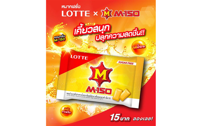 นายซาดาฟูมิ มัตซึชิตะ กรรมการผู้จัดการ บริษัท ไทยลอตเต้ จำกัด กล่าวเสริมว่า “ความร่วมมือกับ M-150 ผู้นำตลาดเครื่องดื่มบำรุงกำลังที่ครองใจคนไทยมาอย่างยาวนานในครั้งนี้ ถือเป็นการต่อยอดความสำเร็จจากความร่วมมือในอดีตที่ได้รับกระแสตอบรับเป็นอย่างดี และในครั้งนี้เราได้ยกระดับไอเดียสู่การสร้างสรรค์หมากฝรั่งในรูปแบบ Coated Gum ผสานกลิ่นเฉพาะตัวของ M-150 ที่ผู้บริโภคคุ้นเคย ปราศจากน้ำตาลและคาเฟอีน ซึ่งเรามั่นใจว่าจะสามารถสร้างความตื่นเต้นให้กับผู้บริโภค พร้อมเติมความคึกคักให้กับตลาด ด้วยการนำเสนอรสชาติที่คุ้นเคยในมิติใหม่ ให้ผู้บริโภคได้เพลิดเพลินอย่างมั่นใจและสนุกไปกับประสบการณ์เคี้ยวสดชื่นในแบบฉบับของ LOTTE x M-150”