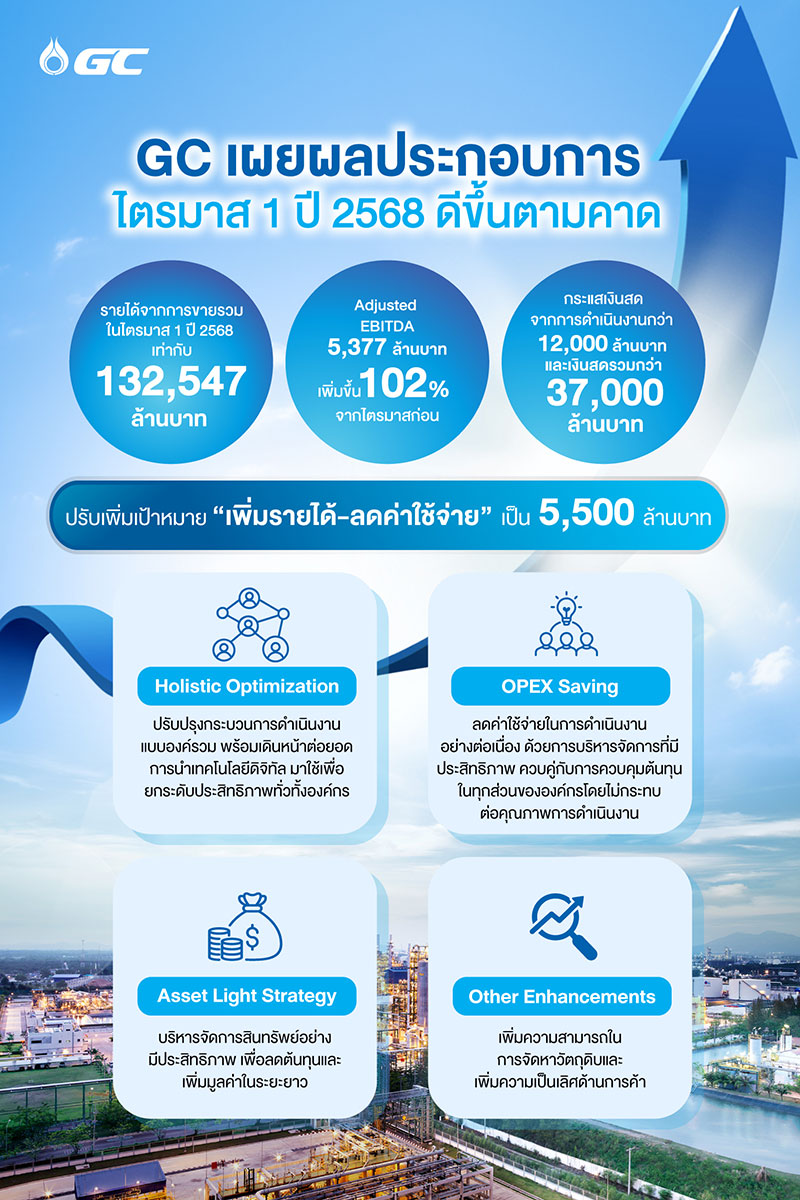 GC มีรายได้จากการขายรวมในไตรมาส 1 ปี 2568 อยู่ที่ 132,547 ล้านบาท และมีกำไรก่อนดอกเบี้ย ภาษี และค่าเสื่อมราคา (Adjusted EBITDA) อยู่ที่ 5,377 ล้านบาท เพิ่มขึ้น 102% จากไตรมาสก่อนหน้า สะท้อนความสำเร็จของการบริหารต้นทุนและเพิ่มประสิทธิภาพในการดำเนินงานอย่างต่อเนื่อง ภายใต้แนวทาง Holistic Optimization แม้ยังคงขาดทุนสุทธิที่ 2,567 ล้านบาท แต่ถือว่าปรับตัวดีขึ้นอย่างมีนัยสำคัญเมื่อเทียบกับไตรมาส 4 ปี 2567 ที่รายงานขาดทุนสุทธิ 11,738 ล้านบาท เนื่องจากรับรู้รายการที่ไม่ได้เกิดขึ้นจากการดำเนินงานปกติ