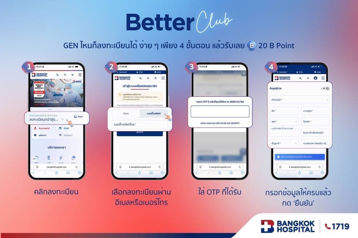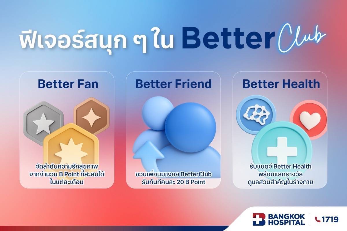โรงพยาบาลกรุงเทพ อยากเห็นคนไทยมี ‘สุขภาพดีขึ้น’ จากการเปิดมุมมองเรื่องโรคและการรักษาที่หลากหลาย จึงเปิดตัว Better Club ชวนคนทุก GEN ร่วมสนุกกับการเก็บ B Point ได้ทุกวันผ่านทางเว็บไซต์ของโรงพยาบาลกรุงเทพ bangkokhospital.com เพื่อนำไปแลกของรางวัลด้านสุขภาพได้โดยไม่ต้องลุ้น