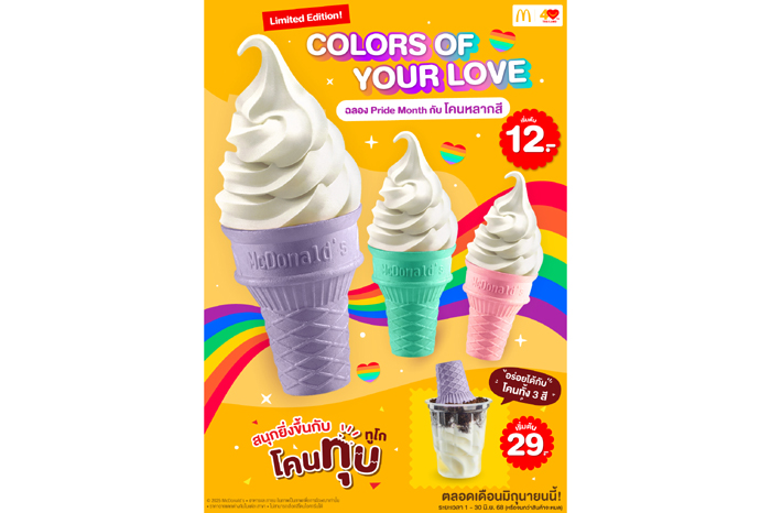 แมคโดนัลด์ ร่วมฉลอง ‘PRIDE MONTH’ สนับสนุนทุกความรักและความหลากหลายอย่างเท่าเทียม ผ่านแคมเปญพิเศษ “COLORS OF YOUR LOVE” ชวนทุกคนมาเติมสีสันให้ทุกความรัก กับไอศกรีมสุดคิ้วท์ “โคนหลากสี” ซอฟท์เสิร์ฟวานิลลา มาพร้อมโคนสีสันสดใส 3 สี ทั้งสีม่วง สีชมพู และสีเขียว ราคาเริ่มต้นเพียง 12 บาท เพิ่มความสนุกได้ยิ่งขึ้นกับเมนู “โคนทุบหลากสี ทูโก” ไอศกรีมวานิลลา โรยโอรีโอครัมป์จุใจ มาพร้อมโคนหลากสีให้ “ทุบ” แล้วอร่อยกรุบกรอบแบบลงตัว ราคาเริ่มต้นเพียง 29 บาท