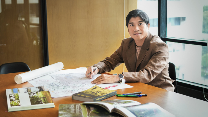 นอกจากนี้ การดีไซน์พื้นที่ยังได้คำนึงถึงมาตรฐานการรับรอง LEED ซึ่งเป็นมาตรฐานของอาคารสีเขียว โดยการใช้วัสดุธรรมชาติที่ทดแทนได้ อาทิ การสร้างทางเดินลาดด้วยไม้ที่เป็นวัสดุธรรมชาติที่มีความทนทานและสามารถทดแทนได้ และยังสร้างประสบการณ์ให้ผู้ใช้รู้สึกอบอุ่นเหมือนได้สัมผัสธรรมชาติจริง ๆ การใช้หินในบางพื้นที่ และใช้วัสดุทดแทน อย่างกรวดและทรายขัดล้างแทนที่ซีเมนต์เบส เพื่อให้ได้สีสันความสวยงามตามธรรมชาติและทำให้พื้นผิวมีความน่าสนใจ และอีกหนึ่งสิ่งที่สำคัญ คือ งานโครงสร้าง โดยเราได้ร่วมทำงานกับ Structure Engineer ที่ได้ออกแบบและวางรูปแบบโครงสร้างที่มีความซับซ้อนสูง เพื่อรองรับแพลตฟอร์มของอาคารทั้ง 4 องค์ประกอบ ทั้งโรงแรม ที่พักอาศัย ศูนย์การค้า และสำนักงาน ที่มีลักษณะและรูปแบบที่แตกต่างกัน เรามีการขึ้นโครงสร้างและคานของสวนในทุกขั้นตอนในเชิงสามมิติ ครบทุกโซน ทุกรายละเอียด เพื่อให้ง่ายต่อการ Joint ทุกชิ้นส่วนเข้าด้วยกัน สร้างความแข็งแรงให้โครงสร้างสามารถรองรับน้ำหนักได้มากและไม่รั่วซึม ทำให้พื้นที่ด้านบนสามารถรองรับได้ทั้งต้นไม้ขนาดใหญ่ น้ำตก และพื้นที่กิจกรรมต่างๆ”