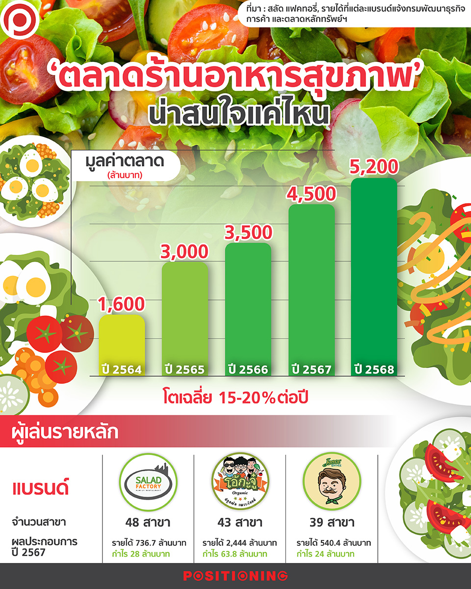 อย่างไรก็ตาม แม้จะมีการเติบโตน่าสนใจ ขณะเดียวกันตลาดดังกล่าวก็มีการแข่งขันดุเดือด เพราะจากปี 2564 มีแบรนด์ให้เลือกในตลาดแค่หลักหน่วย แต่ตอนนี้มีมากกว่า 20 แบรนด์ โดยผู้เล่นหลัก ได้แก่ สลัดแฟคทอรี่ด้วยจำนวนสาขา 48 แห่ง, โอ้กะจู๋ 43 สาขา และโจนส์สลัด 39 สาขา