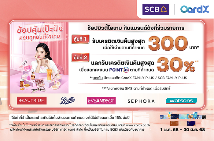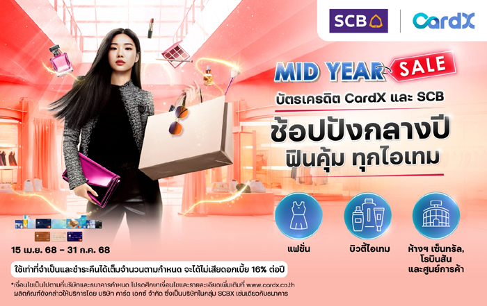 นักช้อปตัวจริงห้ามพลาด! คาร์ดเอกซ์ ตอกย้ำภาพลักษณ์ผู้นำด้านไลฟ์สไตล์การใช้จ่าย ด้วยแคมเปญใหญ่แห่งปี “Mid-Year Sale ช้อปปังกลางปี ฟินคุ้มทุกไอเทม” ชวนลูกค้าบัตรเครดิต CardX และ SCB เพลิดเพลินไปกับประสบการณ์การช้อปปิงแบบเหนือระดับ ด้วยสิทธิพิเศษตอบโจทย์ทุกไลฟ์สไตล์ ตั้งแต่กลุ่มแฟชั่นนิสต้า บิวตี้เลิฟเวอร์ ไปจนถึงขาช้อปในห้างสรรพสินค้าและศูนย์การค้าชั้นนำ พร้อมมอบเครดิตเงินคืนสูงสุดกว่า 30%* ตลอดแคมเปญ