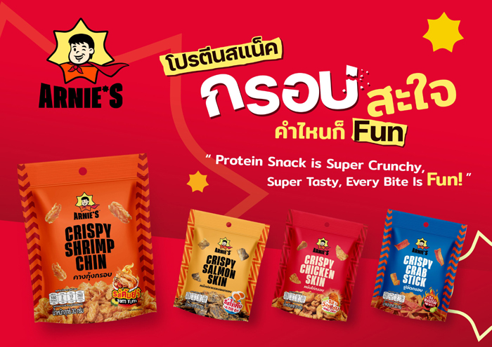 ‘Arnie’s’ ถูกพัฒนาขึ้นเพื่อตอบโจทย์ผู้บริโภคยุคใหม่ที่มองหาขนมขบเคี้ยวที่ให้ทั้งความอร่อย เพลิดเพลิน และคุณประโยชน์จากโปรตีนในเวลาเดียวกัน ด้วยสินค้าหลัก 4 ประเภท ได้แก่ หนังปลาแซลมอนกรอบ ปูอัดกรอบ คางกุ้งกรอบ และหนังไก่กรอบ อัดแน่นด้วยรสชาติถูกใจผู้บริโภคยุคใหม่มากถึง 5 รสชาติ ได้แก่ รสชาติคลาสสิก รสไข่เค็ม รสต้มยำ รสแซ่บซี้ด และรสวิงซ์แซ่บ