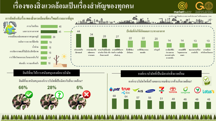 ผลสำรวจล่าสุดประจำปี 2568 โดยมาร์เก็ตบัซซ (หรือ Marketbuzzz) ร่วมกับวิทยาลัยโลกคดีศึกษา มหาวิทยาลัยธรรมศาสตร์ เผยว่า สิ่งแวดล้อมยังคงเป็นปัญหาอันดับหนึ่งที่คนไทยกังวลมากที่สุด อย่างต่อเนื่อง แม้จะเผชิญกับแรงกดดันทางเศรษฐกิจและค่าครองชีพที่สูงขึ้นก็ตาม
