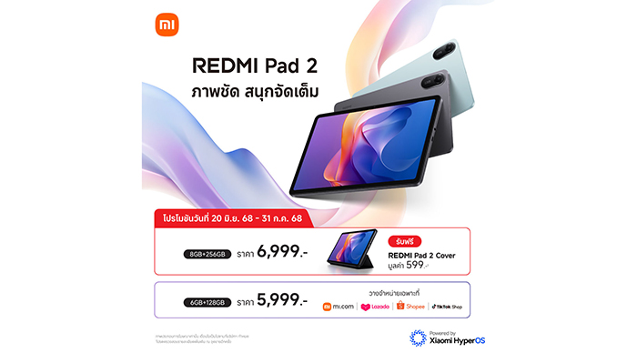 แท็บเล็ต Redmi Pad 2 พร้อมวางจำหน่ายในประเทศไทยแล้ว โดยมีให้เลือก 2 สี ได้แก่ Graphite Gray และ Mint Green โดยรุ่นความจุ 6GB + 128GB วางจำหน่ายในราคา 5,999 บาท เฉพาะที่ช่องทางการจัดจำหน่ายทางออนไลน์แพลตฟอร์ม mi.com, Lazada, Shopee และ TikTok Shop และรุ่นความจุ 8GB + 256GB วางจำหน่ายในราคา 6,999 บาท ที่ Xiaomi Store และร้านตัวแทนจำหน่ายที่ร่วมรายการทั่วประเทศ รวมถึงช่องทางการจัดจำหน่ายทางออนไลน์แพลตฟอร์ม mi.com, Lazada, Shopee และ TikTok Shop พิเศษ! เฉพาะลูกค้าที่ซื้อ Redmi Pad 2 รุ่นความจุ 8GB + 256GB ในระหว่างวันที่ 20 มิถุนายน 2568 – 31 กรกฎาคม 2568 รับฟรี Redmi Pad 2 Cover มูลค่า 599 บาท15