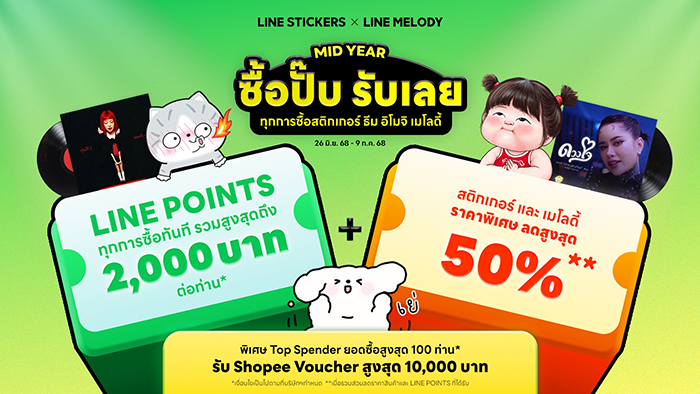 ช้อปก่อน คุ้มก่อน! รีบเลือกสติกเกอร์และเมโลดี้ที่ใช่ แล้วมาเก็บ LINE POINTS จุก ๆ โดย 1 LINE POINTS มีมูลค่าเท่ากับ 1 บาท สามารถใช้แทนเงินสดได้ทั้งบนแพลตฟอร์ม LINE และร้านค้าชั้นนำกว่า 300,000 แห่งทั่วประเทศ ทั้งช้อป กิน เที่ยว เดินทาง และจ่ายบิลต่าง ๆ ผ่าน LINE Pay ตอบโจทย์อินไซต์ผู้ใช้ที่มองหาความคุ้มค่า พร้อมลุ้นรับโค้ดส่วนลด Shopee ก่อนใคร กับแคมเปญ “ซื้อปั๊บ รับเลย” ได้ตั้งแต่วันที่ 26 มิถุนายน – 9 กรกฎาคม 2568 นี้เท่านั้น ติดตามรายละเอียดเพิ่มเติมได้ที่ https://lin.ee/c3BGLXm/sknj/pr
