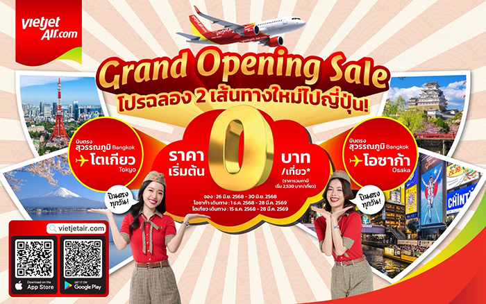 เพื่อฉลองการเปิดเส้นทางบินใหม่ เวียตเจ็ทไทยแลนด์มอบโปรโมชั่นพิเศษ ‘Grand Opening Sale’ เสนอบัตรโดยสารราคาพิเศษ เริ่มต้นเพียง 0 บาท (ราคาไม่รวมภาษีและค่าธรรมเนียม) โดยเปิดให้จองตั้งแต่วันที่ 26 – 30 มิถุนายน 2568 ใช้สำหรับเดินทางระหว่างวันที่ 1 ธันวาคม 2568 – 28 มีนาคม 2569 สำหรับเส้นทาง กรุงเทพฯ (สุวรรณภูมิ) – โอซาก้า และระหว่างวันที่ 15 ธันวาคม 2568 – 28 มีนาคม 2569 สำหรับเส้นทาง กรุงเทพฯ (สุวรรณภูมิ) – โตเกียว