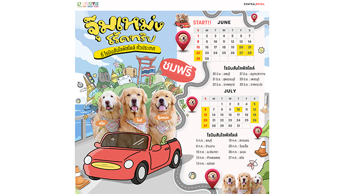 ศูนย์การค้าโรบินสันไลฟ์สไตล์ ในเครือเซ็นทรัล รีเทล ชวนแฟนคลับสายขนฟูร่วมสร้างโมเมนต์สุดอบอุ่นใจผ่านกิจกรรม “จุ๊มเหม่ง โร้ดทริป” การเดินทางครั้งพิเศษของน้องหมาโกลเด้นรีทรีฟเวอร์ชื่อดัง “จุ๊มเหม่ง” พร้อมผองเพื่อน “เจได” และ “ใจดี” ที่จะพาแฟน ๆ ไปพบกับความน่ารัก ขี้เล่น และความสุขแบบใกล้ชิดตลอดเส้นทางทั่วประเทศ มาพร้อมกิจกรรม Meet & Greet สุดเอ็กซ์คลูซีฟให้ทุกคนได้ถ่ายภาพร่วมกับน้องๆ ร่วมสนุกกับกิจกรรมบนเวทีสุดครึกครื้น เพื่อช่วยจุดกระแสการท่องเที่ยวไทย กระตุ้นเศรษฐกิจ และสร้างสีสันให้กับแต่ละจังหวัดที่จัดกิจกรรม ตลอดเส้นทาง ตั้งแต่วันที่ 20 มิ.ย. 68 – 27 ก.ค. 68 ที่ศูนย์การค้าโรบินสันไลฟ์สไตล์ 15 สาขาทั่วประเทศ ชมฟรีตลอดงาน!
