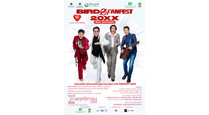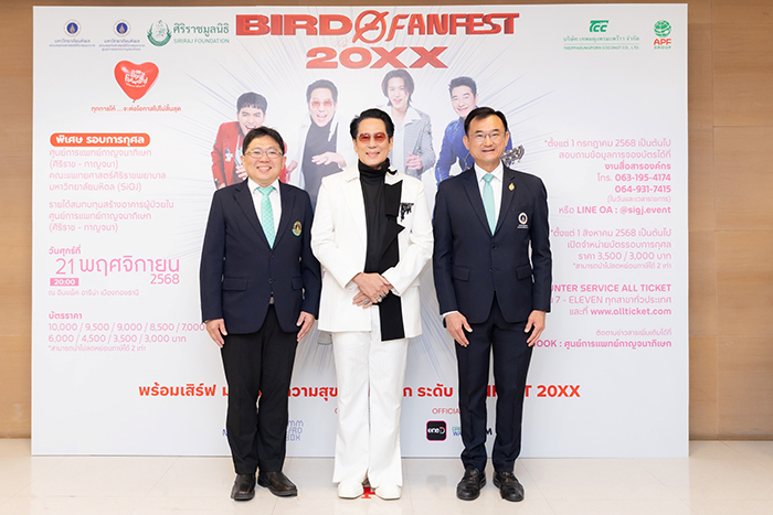 ศูนย์การแพทย์กาญจนาภิเษก คณะแพทยศาสตร์ศิริราชพยาบาล มหาวิทยาลัยมหิดล (SiGJ) เชิญชวนคนไทยร่วมมอบ “โอกาส” ทางการรักษาให้กับผู้ป่วย ด้วยการซื้อบัตรคอนเสิร์ต “BIRD FANFEST 20XX” รอบการกุศล : ศูนย์การแพทย์กาญจนาภิเษก คณะแพทยศาสตร์ศิริราชพยาบาล มหาวิทยาลัยมหิดล ส่งผ่านความสุขและรอยยิ้มโดยศิลปินซูเปอร์สตาร์ขวัญใจคนทุกวัยเบิร์ด ธงไชย แมคอินไตย์ ในรอบการแสดงวันศุกร์ที่ 21 พฤศจิกายน 2568 เวลา 20.00 น. ณ อิมแพ็ค อารีน่า เมืองทองธานี รายได้จากการจำหน่ายรอบดังกล่าว จะนำไปสมทบทุนสร้างอาคารหอ ผู้ป่วยใน ศูนย์การแพทย์กาญจนาภิเษก คณะแพทยศาสตร์ศิริราชพยาบาล มหาวิทยาลัยมหิดล