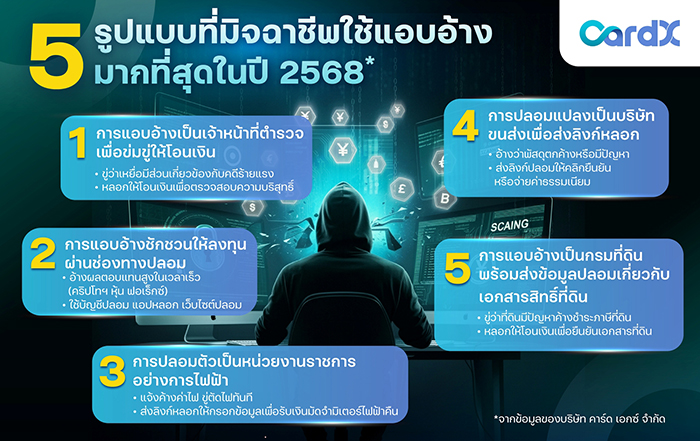 CardX ยังได้รวบรวมข้อมูลเพิ่มเติมเกี่ยวกับรูปแบบการแอบอ้างที่สร้างความเสียหายอย่างกว้างขวางในปีนี้ โดย 5 อันดับแรกที่พบได้แก่