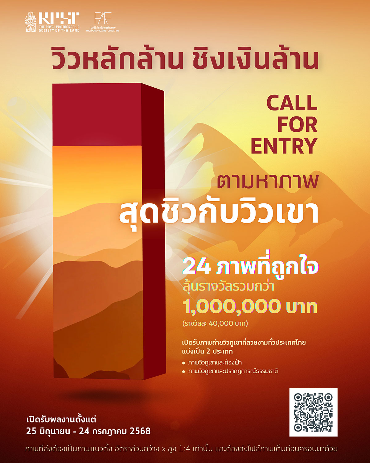 สมาคมถ่ายภาพแห่งประเทศไทย ในพระบรมราชูปถัมภ์ ขอเชิญชวนผู้สนใจส่งภาพผลงานเข้าคัดเลือกใน หัวข้อ “ตามหาภาพสุดชิวกับวิวเขา” ใน Concept วิวหลักล้าน ชิงเงินล้าน เพื่อถ่ายทอดมุมมองความงดงาม ของธรรมชาติโดยเฉพาะวิวภูเขา และร่วมลุ้นเป็น 1 ใน 24 ภาพ ที่จะได้รับค่าตอบแทนรวมกว่า 1 ล้านบาท ส่งผลงานได้ตั้งแต่วันนี้ – 24 กรกฎาคม 2568 ได้ที่ : www.rpst.or.th