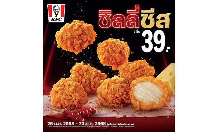 บอกเลยว่าใครได้ลอง ‘ชิลลี่ชีส’ แล้วต่างต้องยอมสยบต่อความอร่อยแบบห้ามใจไว้ไม่อยู่! ด้วยสูตรลับเฉพาะของไก่ทอดที่ทำให้คนคลั่งไก่ต้องหลงรัก ทั้งไก่กรอบและไก่ป๊อปเนื้อนุ่มแน่น คลุกเคล้ากับผงพริกเผาสุดแซ่บสไตล์ไทยที่มีกลิ่นหอมเป็นเอกลักษณ์ ให้รสชาติเผ็ดจัดจ้านถึงใจแบบไทยแท้ ทุกคำยิ่งฟินเมื่อผงพริกเผาแซ่บเข้ากันอย่างลงตัวกับผงชีสรสละมุน ความกรอบนอกนุ่มในระเบิดรสชาติทั้งความแซ่บและชีสซี่ในปากแบบหยุดไม่ได้! ความซับซ้อนแต่ลงตัวนี้เองที่ทำให้ ‘ชิลลี่ชีส’กลายเป็นเมนูระดับตำนานที่แฟน ๆ อดใจไม่อยู่ทุกครั้งที่ได้ลิ้มรสบอกเลยว่านี่คือโอกาสที่ห้ามพลาด รอบนี้ ‘ชิลลี่ชีส’ มีให้เลือกอร่อยถึง 4 เมนูที่ร้าน KFC ทุกสาขาทั่วประเทศ (ยกเว้นสาขาท่าอากาศยานดอนเมืองและสุวรรณภูมิ) ตั้งแต่วันที่ 26 มิถุนายน – 23 กรกฎาคม 2568 เท่านั้น