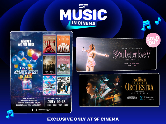 สำหรับเดือนกรกฏาคม และสิงหาคม 2568 นี้ เอส เอฟ ได้ขนทัพคอนเทนต์พิเศษ ภาพยนตร์คอนเสิร์ตมาให้แฟนๆ ได้ชมอย่างต่อเนื่อง ในโปรเจคส์ ‘SF MUSIC IN CINEMA’ ซึ่งผู้ชมจะได้สัมผัสประสบการณ์ดนตรีผ่านระบบเสียงกระหึ่ม พร้อมภาพคมชัดระดับ 4K ซึ่งจะสร้างความประทับใจให้กับแฟนเพลงทุกคนได้อย่างแน่นอน ไม่ว่าจะเป็น ‘HYBE CINE FEST IN ASIA’ รวมเทปบันทึกคอนเสิร์ตสุดยิ่งใหญ่จากศิลปินภายใต้สังกัด HYBE พร้อมฉาย #RUNSEOKJIN_EP.TOUR LIVE LIVE VIEWING AT SF CINEMA ถ่ายทอดสดจากคอนเสิร์ตเดี่ยวครั้งแรกของ Jin อีกหนึ่งสมาชิกของ BTS, ‘You Better Love V The Movie’ เทปบันทึกภาพคอนเสิร์ตใหญ่ครั้งแรกของ วิโอเลต วอเทียร์ และ “The Parkinson” กับครั้งแรกของคอนเสิร์ตศิลปินไทยที่จัดฉายด้วยระบบเสียง Dolby Atmos จัดเต็มที่โรงภาพยนตร์ในเครือ เอส เอฟ เท่านั้น”
