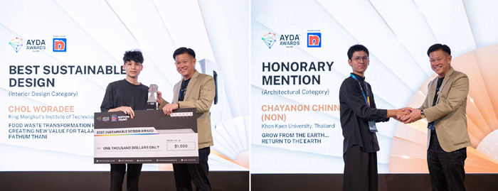 ด้าน นายวัชระ ศิริฤทธิชัย General Manager บริษัท นิปปอนเพนต์ เดคโคเรทีฟ โคทติ้ง (ประเทศไทย) จำกัด กล่าวเสริมว่า “เวทีประกวด AYDA Awards ให้ความสำคัญกับงานออกแบบที่ส่งผลกระทบเชิงบวกต่อสังคมและ สิ่งแวดล้อม พร้อมยกย่องผู้เข้ารอบทุกคนที่ใช้ความคิดสร้างสรรค์จนเกิดเป็นผลงานที่สามารถแก้ไขปัญหาปัจจุบัน และสร้างความเปลี่ยนแปลง เวทีนี้จึงไม่ใช่แค่เวทีประกวดแต่เป็นพื้นที่สำหรับนักออกแบบรุ่นใหม่จากหลายประเทศได้มารวมพลังกันเพื่อสร้างอนาคตที่ดีขึ้น พวกเรารู้สึกภูมิใจอย่างยิ่งที่น้องฌลและน้องนนท์ได้เป็นตัวแทนประเทศไทย ในครั้งนี้ และขอแสดงความยินดีอย่างจริงใจต่อความสำเร็จของทั้งสองคน”