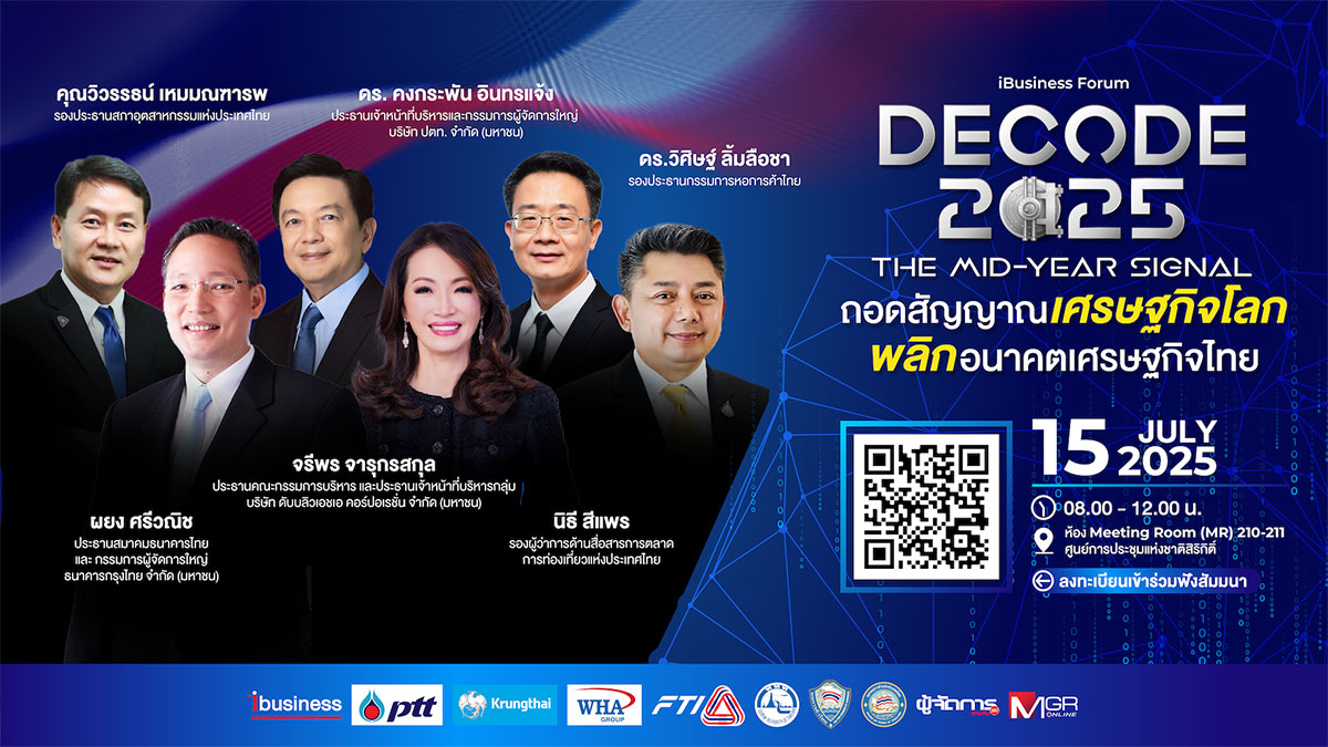iBusiness จัดสัมมนาใหญ่กลางปี “Decode 2025: The Mid-Year Signal ถอดสัญญาณเศรษฐกิจโลก พลิกอนาคตเศรษฐกิจไทย” ในวันที่ 15 กรกฎาคม 2568 นี้ ณ ศูนย์ประชุมแห่งชาติสิริกิติ์ พบกับการบรรยายโดยผู้เชี่ยวชาญจากภาครัฐ และผู้บริหารองค์กรภาคเอกชน