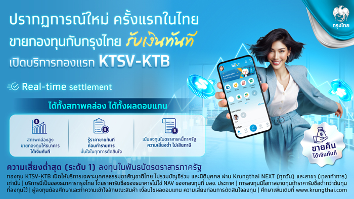 ธนาคารกรุงไทยเปิดตัวบริการ “ขายกองทุนได้เงินทันที” หรือ Real-Time Settlement ครั้งแรกในไทย ผู้ลงทุนสามารถรับเงินเข้าบัญชีได้แบบเรียลไทม์หลังขายกองทุน ทุกวัน ผ่านแอปฯ Krungthai NEXT สร้างทางเลือกใหม่ ในการบริหารสภาพคล่อง ตอบโจทย์การลงทุนยุคดิจิทัล