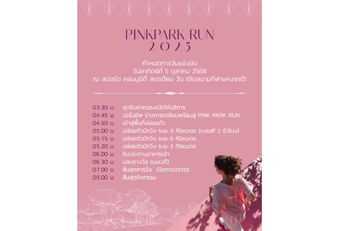 “PINKPARK RUN 2025” จะจัดขึ้นในวันอาทิตย์ที่ 5 ตุลาคมพ.ศ. 2568 ณ สปอร์ต คอมมูนิตี้ สเตเดียมวัน (ติดสนามกีฬาแห่งชาติ) แบ่งเป็น 3 ระยะ ประกอบด้วย ระยะ 3 กิโลเมตร 6 กิโลเมตร 9 กิโลเมตร สำหรับผู้ที่สนใจสามารถซื้อบัตรได้ที่เว็ปไซด์ https://race.thai.run/ หรือสนับสนุนโครงการบ้านพิงพักผ่านบัญชีธนาคารไทยพาณิชย์ ชื่อบัญชี “มูลนิธิศูนย์มะเร็งเต้านมเฉลิมพระเกียรติ” เลขที่ 045-492405-0
