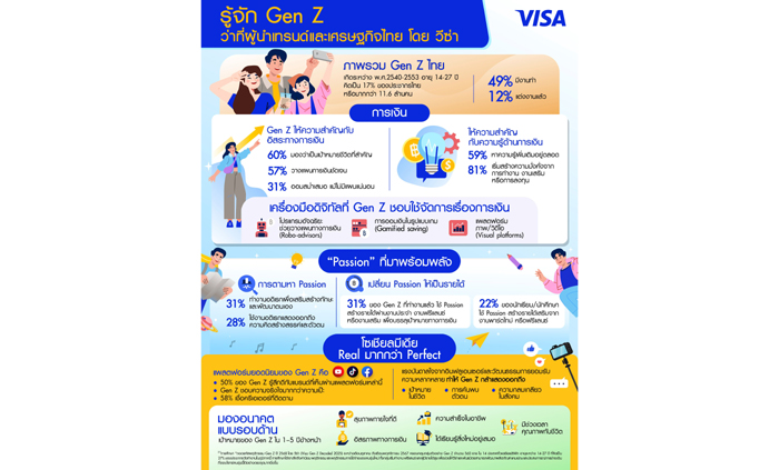 นางอังศุมาลิน ฟอร์ดแฮม หัวหน้าฝ่ายผลิตภัณฑ์และบริการเสริม วีซ่า ประเทศไทย กล่าวว่า “ทุกวันนี้ เราตระหนักว่า Gen Z มีอิทธิพลในการเปลี่ยนแปลงพฤติกรรมและบรรทัดฐานต่าง ๆ ในสังคม ทั้งในแง่ของการใช้จ่าย การเก็บออม การชอปปิง ไปจนถึงการมีส่วนร่วมกับแบรนด์ต่าง ๆ วีซ่ามีเป้าหมายให้การทำธุรกรรมเป็นไปอย่างไร้รอยต่อ ปลอดภัย และครอบคลุมสำหรับคนรุ่นใหม่ ดังนั้นการศึกษาพฤติกรรม Gen Z ไม่เพียงทำให้เราเข้าใจกลุ่มนี้ดียิ่งขึ้น แต่ยังช่วยให้ภาคธุรกิจที่เกี่ยวข้อง มีข้อมูลในการพัฒนาโซลูชันด้านการเงินและสร้างสรรค์ประสบการณ์ดิจิทัลที่ตรงใจคนรุ่นใหม่”