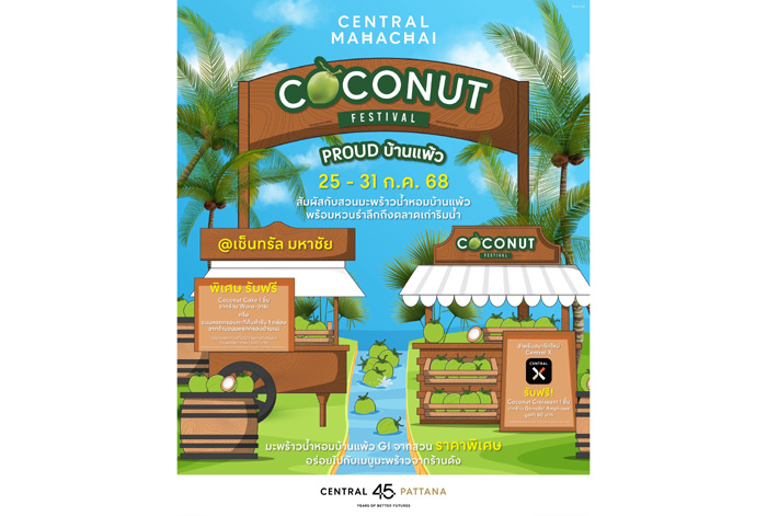 ศูนย์การค้าเซ็นทรัล มหาชัย ร่วมกับสำนักงานพาณิชย์จังหวัดสมุทรสาคร สำนักงานเกษตรจังหวัดสมุทรสาคร และสำนักงานพัฒนาชุมชนจังหวัดสมุทรสาคร รวมพลังจัดงาน “Mahachai Coconut Festival 2025 ตอน Proud บ้านแพ้ว” มหกรรมสุดยิ่งใหญ่ที่รวมเสน่ห์ของ “มะพร้าวน้ำหอมบ้านแพ้ว” สินค้า GI ของจังหวัดสมุทรสาคร เพื่อส่งเสริมผลผลิตท้องถิ่น สร้างคุณค่า เพิ่มโอกาสทางการตลาด และผลักดันให้เป็นที่รู้จักในวงกว้างทั้งในประเทศและระดับสากล โดยงานจะจัดขึ้นระหว่างวันที่ 25–31 กรกฎาคม 2568 ณ ลานโปรโมชั่น ชั้น 1 ศูนย์การค้าเซ็นทรัล มหาชัย