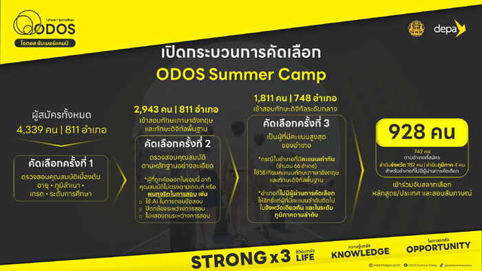 ผศ.ดร.ณัฐพล นิมมานพัชรินทร์ ผู้อำนวยการใหญ่ สำนักงานส่งเสริมเศรษฐกิจดิจิทัล หรือ ดีป้า เปิดเผยว่า ตามที่คณะรัฐมนตรีได้มอบหมายให้กระทรวงดิจิทัลเพื่อเศรษฐกิจและสังคม โดย ดีป้า เป็นหน่วยงานหลักในการดำเนินโครงการ ODOS Summer Camp ค่ายแห่งโอกาสภาคฤดูร้อน ทุนการศึกษาแบบให้เปล่า จำนวน 928 ทุน ซึ่งมีวัตถุประสงค์เพื่อเปิดโอกาสให้เยาวชนไทยได้มีประสบการณ์การใช้ชีวิตและการศึกษาในมหาวิทยาลัยชั้นนำในต่างประเทศ ระยะเวลา 5-6 สัปดาห์ พร้อมยกระดับทักษะดิจิทัลจากเจ้าของเทคโนโลยีที่เป็นบริษัทเทคโนโลยีระดับโลก และค้นหาแรงบันดาลใจเพื่อต่อยอดไปสู่การเลือกสายการเรียนในระดับที่สูงขึ้น รวมไปถึงสายอาชีพในอนาคต โดยขณะนี้ผ่านการคัดเลือกผู้เข้าร่วมโครงการไปแล้ว 3 ครั้ง โดยการทดสอบทักษะภาษาอังกฤษและทักษะดิจิทัลซึ่งมีผู้ผ่านการคัดเลือก 928 คน จาก 878 อำเภอทั่วประเทศ และ 50 เขตในกรุงเทพมหานคร หลังจากนี้ผู้ที่ผ่านการคัดเลือกจะเข้าร่วมกิจกรรมจับสลากเลือกหลักสูตร/ประเทศ และสอบสัมภาษณ์ในวันเสาร์ที่ 26 กรกฎาคมนี้ที่บางกอก คอนเวนชั่นเซ็นเตอร์ ชั้น 22 เซ็นทาราแกรนด์ แอท เซ็นทรัลเวิลด์