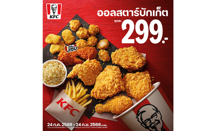 ปีนี้ KFC ประเทศไทย ขอต้อนรับเดือนแห่งวันแม่ด้วยราคาสุดคุ้มแบบไม่ต้องต่อราคาให้เหนื่อย เพราะ KFC ลดให้เลย! กับชุด All Star Bucket (ออล สตาร์ บักเก็ต) จัดเต็มเมนูยอดฮิต ครบทั้งความกลมกล่อมแบบออริจินัลและความอร่อยสไตล์ไทยด้วย ไก่ทอด 5 ชิ้น, ไก่วิงซ์แซ่บ 2 ชิ้น, ชิคเก้นป๊อป 7 ชิ้น, นักเก็ตส์ 3 ชิ้น, เฟรนช์ฟรายส์ (ปกติ) 1 ที่ และข้าวคลุกผู้พัน 1 ที่ ในราคาสุดคุ้มเริ่มต้นเพียงชุดละ 299 บาท (ราคาอาจแตกต่างกันในแต่ละสาขาและช่องทางการจำหน่าย) ตั้งแต่วันที่ 24 กรกฎาคม – 24 กันยายน 2568 ที่ร้าน KFC ทุกสาขาทั่วประเทศ (ยกเว้นสาขาท่าอากาศยานดอนเมือง และสุวรรณภูมิ)