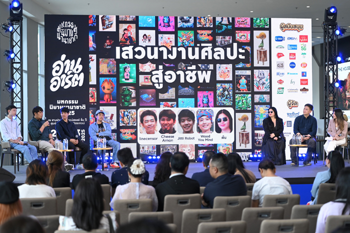 นอกจากชมผลงานศิลป์แล้ว มาแวะเติมแรงบันดาลใจต่อกับกิจกรรมเสวนาในหัวข้อ “ศิลปะสู่อาชีพ” เปิดมุมมองการสร้างรายได้จากงานศิลป์ ผ่านประสบการณ์จริงของศิลปินยุคใหม่ ร่วมเรียนรู้แนวทางการต่อยอดความคิดสร้างสรรค์ให้กลายเป็นอาชีพ ตั้งแต่การสร้างผลงาน การสื่อสารคุณค่าไปจนถึงการปรับตัวในยุคปัจจุบันที่เข้าสู่ยุคดิจิทัล พร้อมแลกเปลี่ยนแนวคิดเพื่อทำให้ศิลปะเป็นแรงขับเคลื่อนชีวิตและการทำงาน ซึ่งกิจกรรมนี้เกิดขึ้นในวันเสาร์ที่ 26 ก.ค. 2568 ที่ผ่านมา