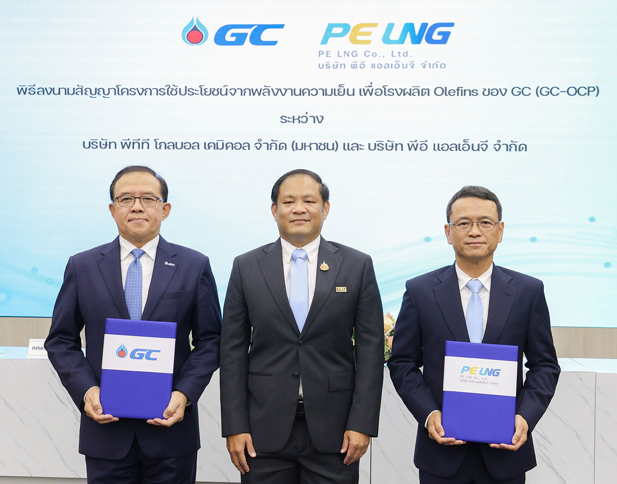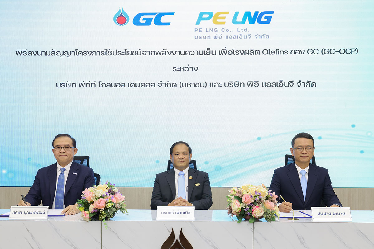 บริษัท พีทีที โกลบอล เคมิคอล จำกัด (มหาชน) หรือ GC ผู้นำในธุรกิจพลาสติกและเคมีภัณฑ์ระดับสากล เพื่อสร้างสรรค์คุณภาพชีวิต และ บริษัท พีอี แอลเอ็นจี จำกัด หรือ PE LNG ซึ่งเป็นธุรกิจร่วมทุนระหว่าง บริษัท พีทีที แอลเอ็นจี จำกัด (PTTLNG) และการไฟฟ้าฝ่ายผลิตแห่งประเทศไทย (กฟผ.) ลงนามในสัญญาความร่วมมือโครงการใช้ประโยชน์จากพลังงานความเย็นของก๊าซธรรมชาติเหลว (LNG) สำหรับโรงผลิตโอเลฟินส์ของ GC ซึ่งจะช่วยเพิ่มประสิทธิภาพด้านพลังงานและลดการปล่อยก๊าซเรือนกระจกในกระบวนการผลิตอย่างเป็นรูปธรรม