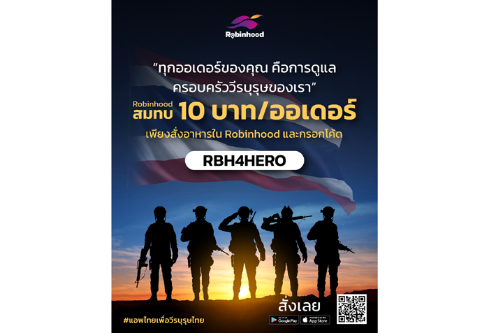 โรบินฮู้ด เดลิเวอรี เดินหน้าสานต่อพันธกิจ “แอปไทยเพื่อคนไทย” เปิดตัวแคมเปญ “Robinhood for Hero” เชิญชวนผู้ใช้งานร่วมเป็นส่วนหนึ่งในการส่งต่อพลังใจสู่ครอบครัวของวีรบุรุษไทย ผ่านการสั่งอาหารที่มาพร้อมการบริจาคโดยไม่เสียค่าใช้จ่ายเพิ่มเติม