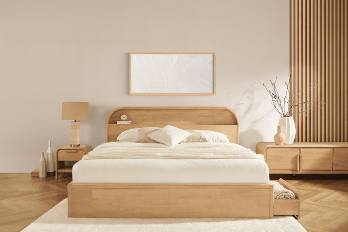 #ห้องนอน: เติมเต็มที่สุดของการพักผ่อนด้วยเตียงไม้รูปทรงเรียบง่าย พร้อมดีไซน์หัวเตียงทรงโค้งสวยงามที่มาพร้อมชั้นวางของในตัว ลิ้นชักข้างขนาดใหญ่ 3 ช่อง รองรับการจัดเก็บได้อย่างจุใจ จัดเข้าชุดกับโต๊ะลิ้นชักข้างเตียงลบเหลี่ยมโค้งมนและโคมไฟตั้งโต๊ะเข้าชุดกัน นอกจากนี้ยังมีตู้เสื้อผ้าบานสไลด์ที่ช่วยประหยัดพื้นที่ ตกแต่งหน้าบานด้วยกระจกนิรภัยลาย PIXEL รวมถึงโต๊ะเครื่องแป้งพร้อมกระจกเงา ลิ้นชักใส่ของและตะขอแขวน ตอบโจทย์ทุกการใช้งานในทุก ๆ วัน