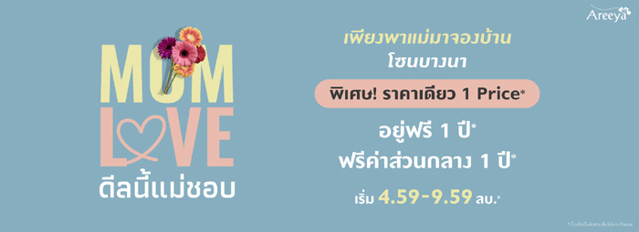 บริษัท อารียา พรอพเพอร์ตี้ จำกัด (มหาชน) ผู้นำด้านอสังหาริมทรัพย์เดินเครื่องเต็มสูบครึ่งปีหลังเปิดแคมเปญ “MOM LOVE ดีลนี้แม่ชอบ” ต้อนรับเดือนแห่งวันแม่ ด้วยข้อเสนอสุดพิเศษแบบจัดเต็ม 3 ต่อ สำหรับลูกค้าที่พาคุณแม่มาจองบ้านโครงการโซนบางนา โดยมีจุดขายหลักคือ “1 Price*” ราคาสุดพิเศษ พร้อมอยู่ฟรี 1 ปี* และฟรีค่าส่วนกลาง 1 ปี*