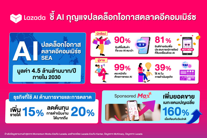 รายงานล่าสุดจาก Momentum Works ร่วมกับลาซาด้า[1] เผยว่าหากผู้ขายในเอเชียตะวันออกเฉียงใต้สามารถใช้ศักยภาพของ AI ได้อย่างเต็มที่ จะสามารถปลดล็อกมูลค่าทางเศรษฐกิจในระบบนิเวศอีคอมเมิร์ซทั่วภูมิภาคได้สูงถึง 4.5 ล้านล้านบาทต่อปี (หรือราว 131 พันล้านดอลลาร์สหรัฐฯ) ภายในปี 2030 ตัวเลขนี้สะท้อนถึงโอกาสมหาศาลในการขับเคลื่อนธุรกิจอีคอมเมิร์ซให้เติบโตอย่างก้าวกระโดด ในฐานะผู้บุกเบิกแพลตฟอร์มอีคอมเมิร์ซในเอเชียตะวันออกเฉียงใต้ ลาซาด้าเล็งเห็นศักยภาพดังกล่าวตั้งแต่แรกเริ่ม และได้นำ AI มาเป็นพลังสำคัญที่ช่วยเสริมขีดความสามารถ ให้ผู้ขายไทยแข่งขันและเติบโตอย่างแข็งแกร่งต่อเนื่อง