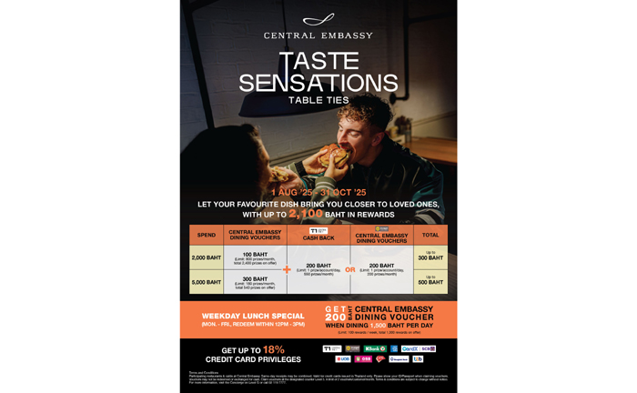 เมื่อความอร่อยไม่ได้มีแค่รสชาติ แต่ยังรวมถึงประสบการณ์ที่สัมผัสได้ เซ็นทรัล เอ็มบาสซีเชิญทุกท่านร่วมเดินทางสู่มิติใหม่ของการกินดื่ม กับ “CENTRAL EMBASSY TASTE SENSATIONS” ที่คัดสรรเมนูสุดพิเศษจากกว่า 50 ร้านอาหารและคาเฟ่ชื่อดัง พร้อมมอบข้อเสนอพิเศษจากพันธมิตรบัตรเครดิตชั้นนำได้แก่บัตรเครดิตเซ็นทรัลเดอะวัน, บัตรเครดิตกรุงศรี, บัตรเครดิตทีทีบีและบัตรเครดิตธนชาต, บัตรเครดิตอเมริกัน เอ็กซ์เพรส, บัตรเครดิตธนาคารกรุงเทพ, บัตรเครดิตยูโอบี, บัตรเครดิตธนาคารออมสิน,บัตรเครดิตคาร์ดเอกซ์และธนาคารไทยพาณิชย์, บัตรเครดิตเคทีซี,และบัตรเครดิตกสิกรไทยเพื่อเติมเต็มทุกมื้อให้กลายเป็นโมเมนต์พิเศษที่เหนือความคาดหมาย ตั้งแต่วันที่ 1 ส.ค. – 31 ต.ค. 68