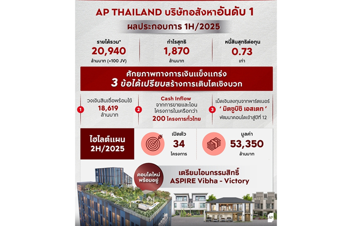 นายรัชต์ชยุตม์ นันทโชติโสภณ ว่าที่ประธานฝ่ายบริหาร (President-designate) บริษัท เอพี ไทยแลนด์ จำกัด (มหาชน) ซึ่งจะมีผลอย่างเป็นทางการในวันที่ 1 กันยายน 2568 ตามประกาศที่ได้แจ้งไว้กับทางตลาดหลักทรัพย์แห่งประเทศไทย กล่าวว่าผลการดำเนินงานครึ่งปีแรกเป็นข้อพิสูจน์ชัดเจนถึงศักยภาพของเอพี ไทยแลนด์ ในฐานะ #APThaiบริษัทอสังหาฯอันดับ1 ที่ยังคงเติบโตอย่างมั่นคงและแข็งแกร่ง แม้ต้องเผชิญกับปัจจัยท้าทายรอบด้าน ทั้งภาวะเศรษฐกิจโลกที่ยังไม่ฟื้นตัวเต็มที่ ภาพรวมเศรษฐกิจไทยที่เติบโตแบบชะงัก ซึ่งล้วนส่งผลต่อความผันผวนของตลาดอสังหาริมทรัพย์ และกระทบต่อกำลังซื้อรวมถึงความเชื่อมั่นของผู้บริโภคอย่างเลี่ยงไม่ได้ แต่ทุกกลุ่มธุรกิจในเครือเอพี ไทยแลนด์ยังคงรักษาการเติบโตได้อย่างต่อเนื่องในทุกมิติ