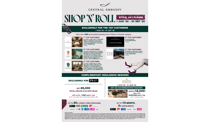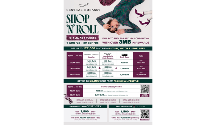 เซ็นทรัล เอ็มบาสซี ศูนย์กลางแฟชั่นและไลฟ์สไตล์ระดับโลกใจกลางกรุงเทพฯ ชวนคุณร่วมขับเคลื่อนจังหวะแห่งสไตล์ไปกับ “CENTRAL EMBASSY SHOP ‘N’ ROLL 2025” ช่วงเวลาสำคัญในการมอบประสบการณ์การเลือกสรรสู่มิติใหม่ ต้อนรับฤดูกาล Fall/Winter 2025 ด้วยข้อเสนอและเอกสิทธิ์พิเศษเหนือระดับที่รังสรรค์มาเพื่อนักช้อปและนักสะสมที่ปรารถนาความพิเศษอย่างแท้จริง ตั้งแต่วันที่ 1 ส.ค. 68 – 30 ก.ย. 68