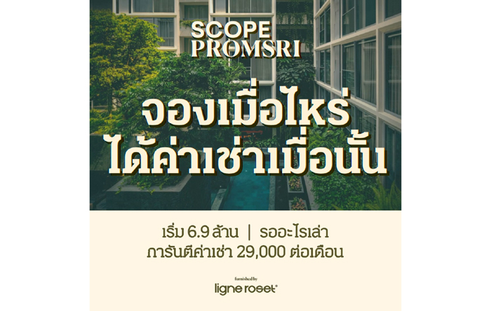 โครงการ สโคป พร้อมศรี ตอกย้ำความสำเร็จด้านการลงทุนด้วยยอดขายกว่า 75% และอัตราผู้ซื้อเพื่อลงทุนปล่อยเช่าสูงถึง 65% ล่าสุดเปิดตัวแคมเปญพิเศษ “จองเมื่อไหร่ ได้ค่าเช่าเมื่อนั้น” ที่มอบโอกาสให้นักลงทุนเริ่มรับรายได้ทันที พร้อมสิทธิประโยชน์รวมมูลค่าสูงสุดกว่า 460,000 บาท โดยผู้ซื้อจะได้รับการการันตีค่าเช่าเริ่มต้นเดือนละ 29,000 บาท โดยจะเริ่มปล่อยเช่าภายใน 14 วันหลังจองและรับค่าเช่ายาวต่อเนื่องนาน 1 ปีเต็ม ในราคาเริ่มต้น 6.9 ล้านบาท พร้อมรับสิทธิ