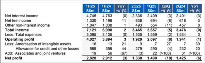 กำไรจากการดำเนินงานเพิ่มขึ้นร้อยละ 3 ที่ 4.0 พันล้านเหรียญสิงคโปร์ในครึ่งปีแรกของปี 2568 โดยได้รับแรงสนับสนุนจากการเติบโตของรายได้ค่าธรรมเนียมในระดับเลขสองหลัก ขณะที่กำไรสุทธิลดลงร้อยละ 3 จาก 2.9 พันล้านเหรียญสิงคโปร์ในปีที่แล้ว อยู่ที่ 2.8 พันล้านเหรียญสิงคโปร์เนื่องจากการตั้งสำรองทั่วไปเชิงป้องกันเพื่อรับมือกับความไม่แน่นอนทางเศรษฐกิจ